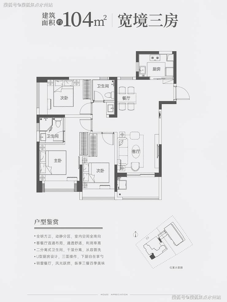 104㎡三房两卫:竖厅南北通透,U型厨房(操作台面4.5米),主卧带270°飘窗,东南朝向阳台,得房率75.19%。