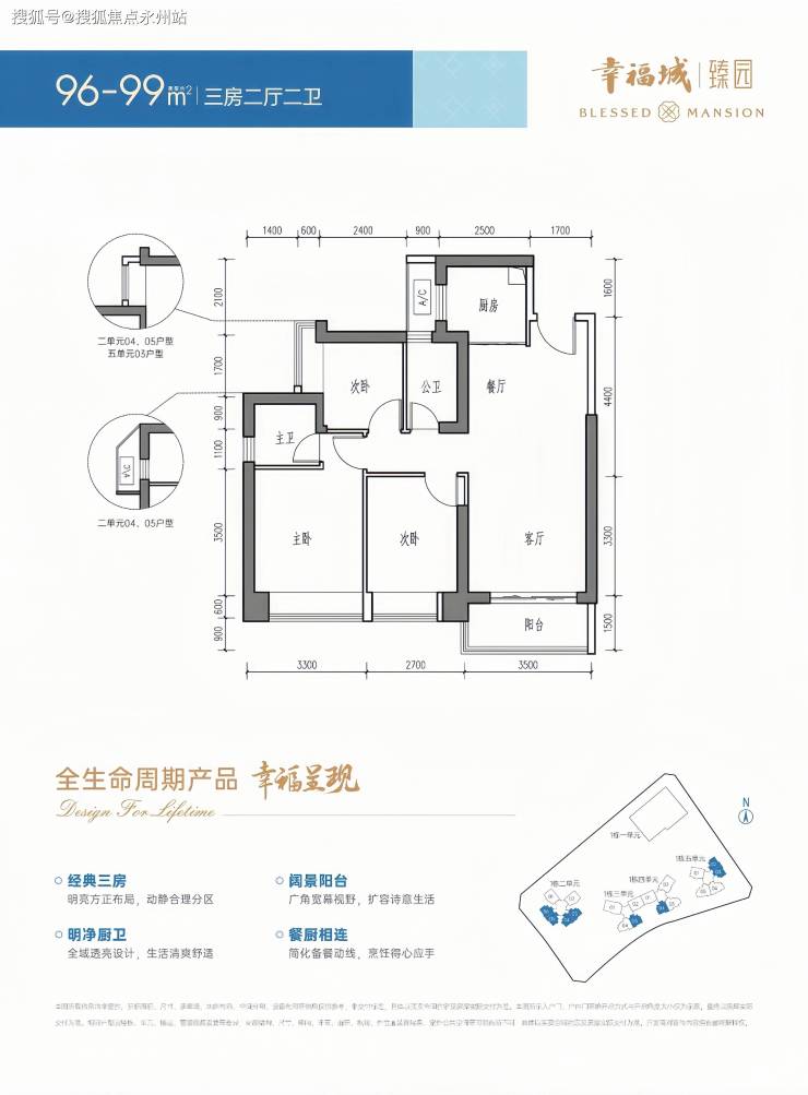 96-99㎡的3房2厅2卫,设计的是经典竖厅格局,客厅3.5米开间,LDKB一体化设计,动静分区,3个卧室分别做到了主卧14.63㎡/次卧11.07㎡/次卧7.26㎡(包含墙体飘窗),U型厨房,卫生间干湿分离,得房率约81-84%(包含赠送),东南/西南或东北朝向。