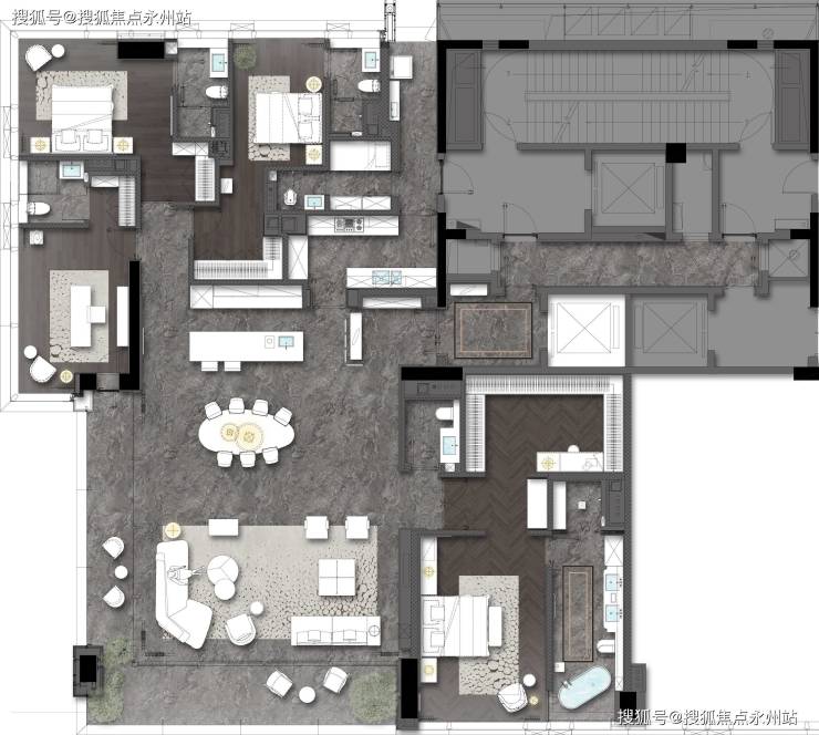 滨海艺术公寓丨面积与户型:主打约380平方米大平层,仅26席,一层三梯两户,专梯入户,镜像对称户型。