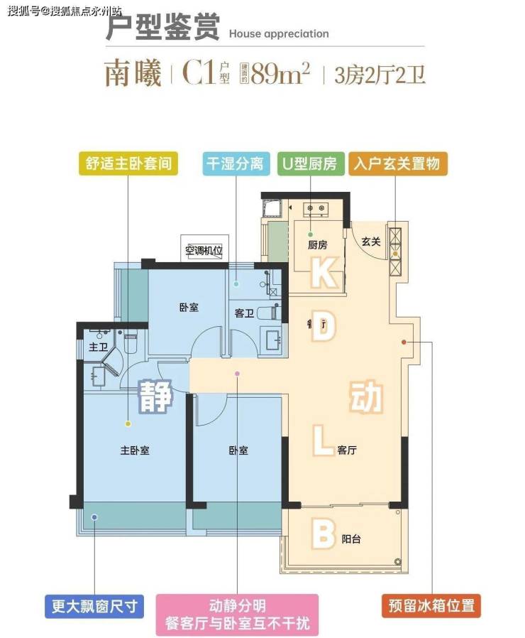 约89㎡3房2厅2卫:三开间朝南,南向采光面达约9.5m,同时比市面大多数同类户型多出一个卫生间,让生活起居更从容。