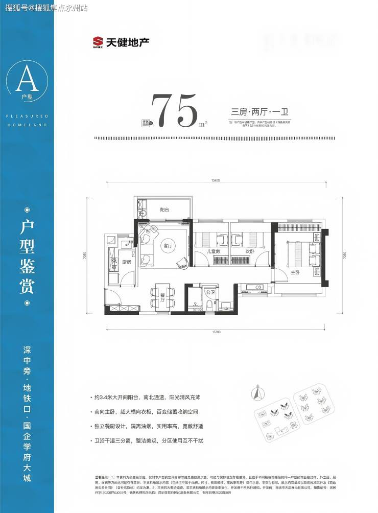 A 户型:3 室 2 厅 1 卫,约 75㎡
