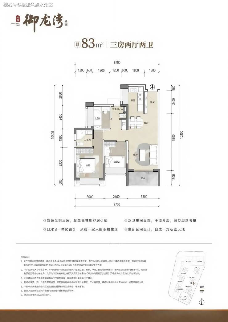 83㎡3房2卫,分布在2栋2单元03/04户型,设计的是竖厅格局,客厅开间3.3米,LDKB一体化设计,三开间朝南,U型厨房,公卫三段式分离设计,得房率约79.25%(不含赠送),东南或西南朝向,加上赠送得房率约89%。