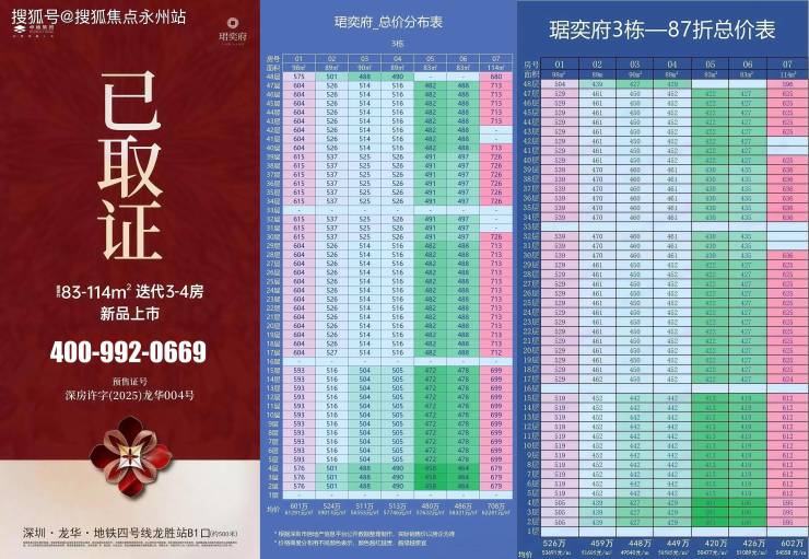位于龙华大浪片区的「卓越珺奕府二期」于2025年4月14日取证,开盘综合折扣约8.76折,折后单价4.73万-5.59万,总价401万起买精装三房!本次推售二期3栋,共311套房源(推售309套),户型有83㎡的3房2卫、89㎡的3房2卫、98-114㎡的4房2卫,计划2027年6月30日前带精装交付。
