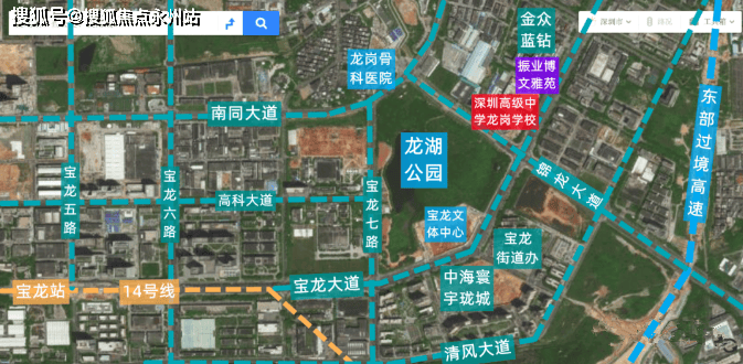 项目紧挨着深圳高级中学龙岗学校,北侧是金众蓝钻,周边有占地25万㎡的龙湖公园,龙岗骨科医院,14号地铁线“宝龙站”距离约1.9公里,还有东部过境高速即将开通。