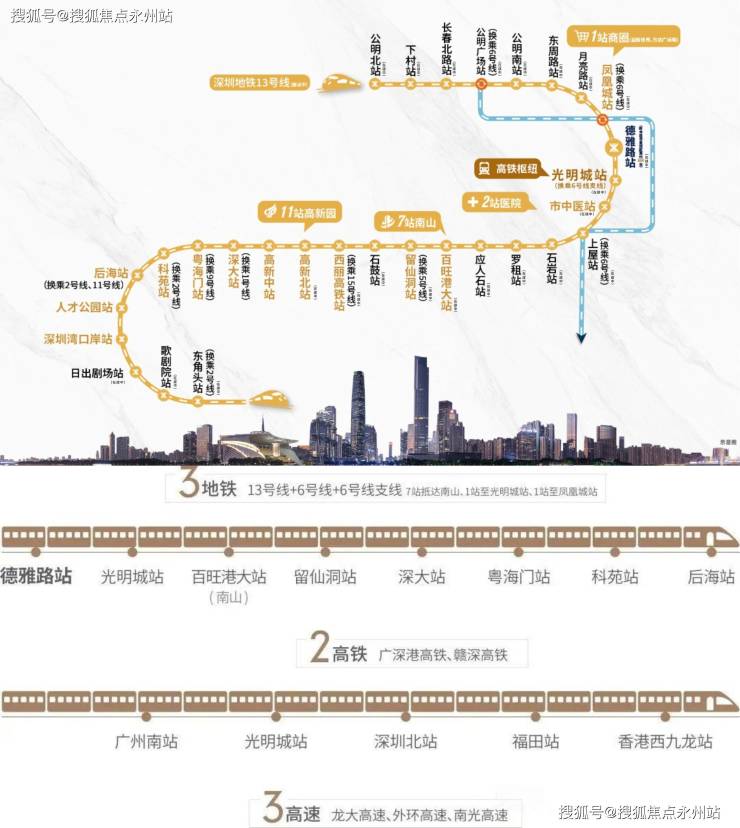 项目距离地铁13号线德雅路站(原同观路站)仅约100米,该线路预计2025年底通车,最高时速100公里,1站直达光明城站,7站可抵南山高新园,8站到留仙洞总部基地,11站至深圳湾口岸,实现南山、福田核心区30分钟通勤圈,临近地铁 6号线光明城站,可快速换乘至福田、罗湖等区域。
