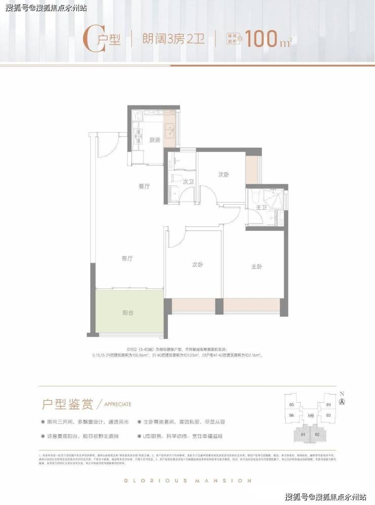 100㎡的3房2厅2卫:1栋A座01.02户型,设计的是竖厅格局,客厅3.55米开间,LDKB一体化,动静分区,三开间朝南,3个卧室分别做到了3.15米/2.85米/2.5米的宽度,U型厨房,卫生间干湿分离,阳台正南朝向。