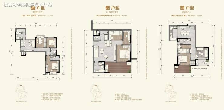 精装刚需户型:82-88㎡三房两厅两卫:三梯六户设计,精装交付,南向或西南向,双阳台配置,主卧带独立衣帽间,得房率约82%;
