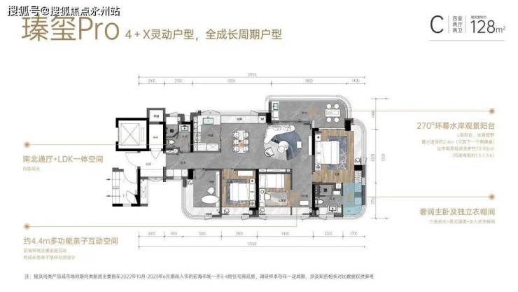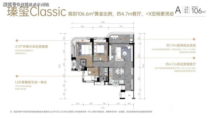 其中建面约106/107㎡3房(约240套)和128㎡4房(约80套),创新实用品质户型,传加上阳台半赠送飘窗全赠送拓展使用率高达约90%,3.27容积率,23层水岸住宅