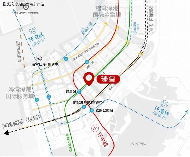 【交通配套】项目位于5号线,步行500米妈湾站、步行700米到铁路公园站,同时铁路公园站还规划了5号线与9号线换乘,未来将于宝安新老中心、南山重点区、蛇口、西丽、前海片区串联起来,此外,将还有15、21、27、穗莞深城际等多条轨道交通串联前海与其他重点片区。