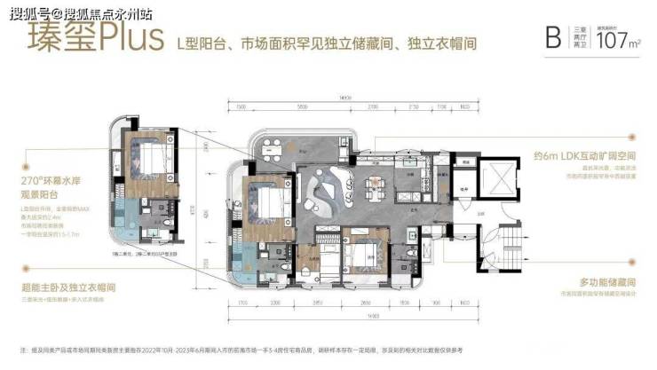 建面约107㎡的横厅3房,可以做到3+1房,L型阳台,主卧三面采光,还配置了独立衣帽间。整体使用率接近86%。