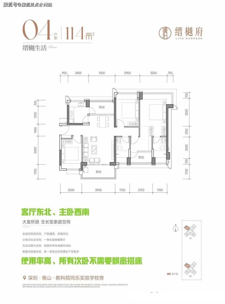 客厅阳台朝向以东南或西南为主,只有04户114㎡户型阳台是朝东北的,但由于它的产品都是双大面宽采光且整个餐客厅完全通透,所以即便是东北向,室内通风采光也不会有啥问题。