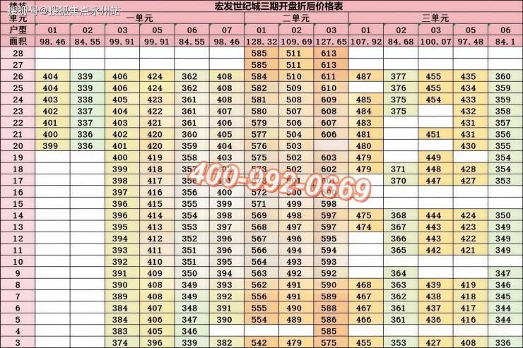 宏发世纪城三期(备案名:名峯世纪府)于2025年8月15日开盘入市,目前剩余少量房源在售。项目整体折后均价4.29万/㎡,单价区间3.74-4.8万/㎡,具体户型价格如下: