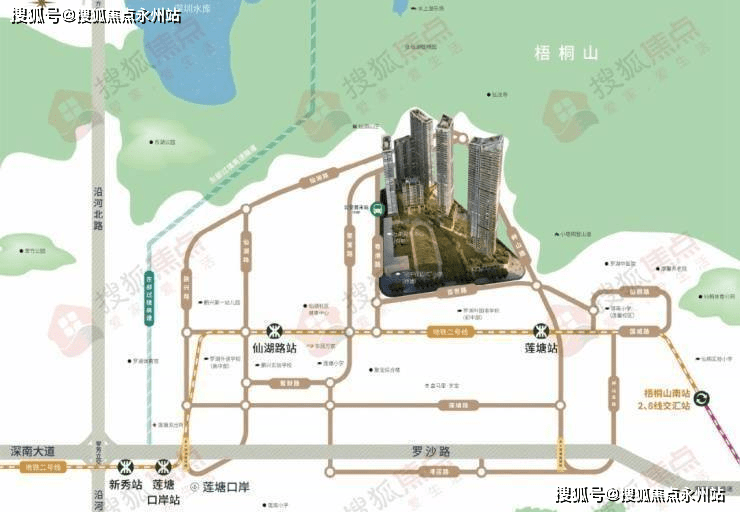 本项目地址位于深圳市罗湖区莲塘街道莲十路与畔山路交汇处,毗邻仙湖植物园和仙桐体育公园。万象罗湖不能少莲塘,作为罗湖东部的后花园,莲塘一直是以生态著名,背靠梧桐山,比邻仙湖植物园,自然资源非常丰富,不过也因过于“自然”从而和“城市”之间有所“间隔”。