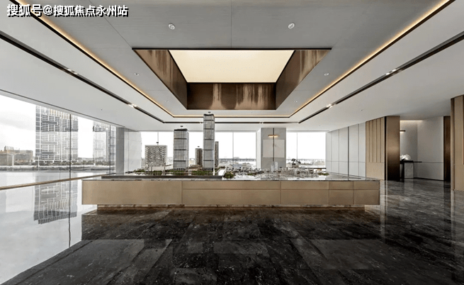 沙盘区以一种简洁澄明的姿态出现在影视厅之后,沙盘矩形底座与天花造型相契合,模型如从上缓缓落下,暗含着前海鸿荣源中心前沿、尊贵的高端定位。