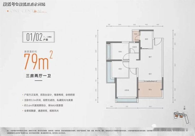 建面约79㎡ 3房2厅1卫:传统竖厅动静分区,LDK一体化布局,双阳台+3飘窗附加配置,比较经典,虽然整体会偏紧凑了些,但实用非常强,并且兼具低总价优势,3.6米的客厅开间尺度优于市面上大多数同建面户型。