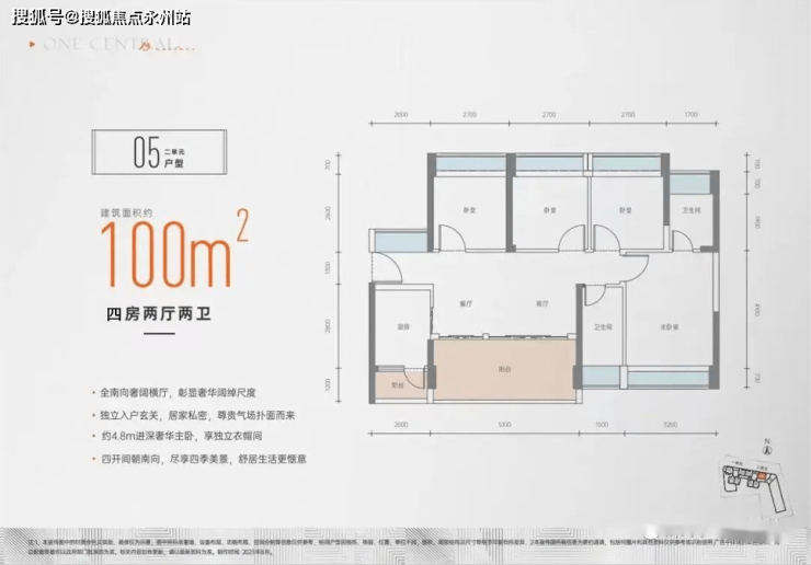 建面约100㎡ 4房2厅2卫:隐性过道横厅+5.1米宽景阳台,LDK一体化布局,宽景阳台+生活阳台+7飘窗的附加配置,结构与89㎡户型相似,除了动区部分小了0.82㎡外,其它功能间均有所放大,但差距微乎其微,主要还是多了一个卧室和公卫位置不一样的区别。