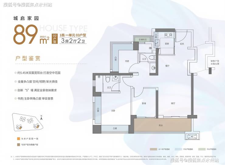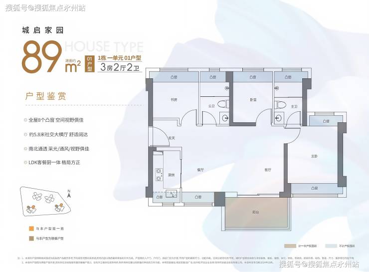 89㎡的3房2厅2卫,02.03户型,设计的是经典竖厅格局,客厅3.4米开间,LDKB一体化,S墙设计预留冰箱卡槽位,动静分区,三开间朝南,3个卧室分别做到了主卧13.79㎡/次卧7.62㎡/次卧6.93㎡(包含墙体飘窗),主卧+1个次卧270°飘窗设计,U型厨房,公卫三段式分离,客厅连接卧室出5.75米长的大阳台,得房率约87.2%(包含赠送),东南朝向。