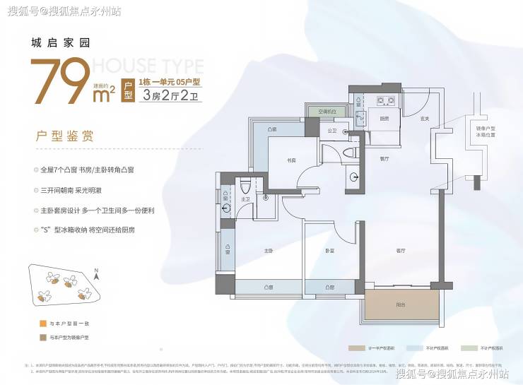 79㎡的3房2厅2卫,设计的是经典竖厅格局,客厅3.3米开间,LDKB一体化,S墙设计预留冰箱卡槽位,动静分区,三开间朝南,3个卧室分别做到了主卧12.1㎡/次卧7.36㎡/次卧6.67㎡(包含墙体飘窗),主卧+1个次卧270°飘窗设计,U型厨房,公卫三段式分离,得房率约88%(包含赠送),东南或西南朝向。