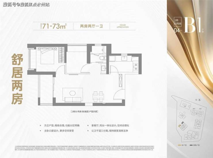 71-73㎡的2房2厅1卫,设计的是竖厅格局,客厅开间3.2米,西南跟东北向。