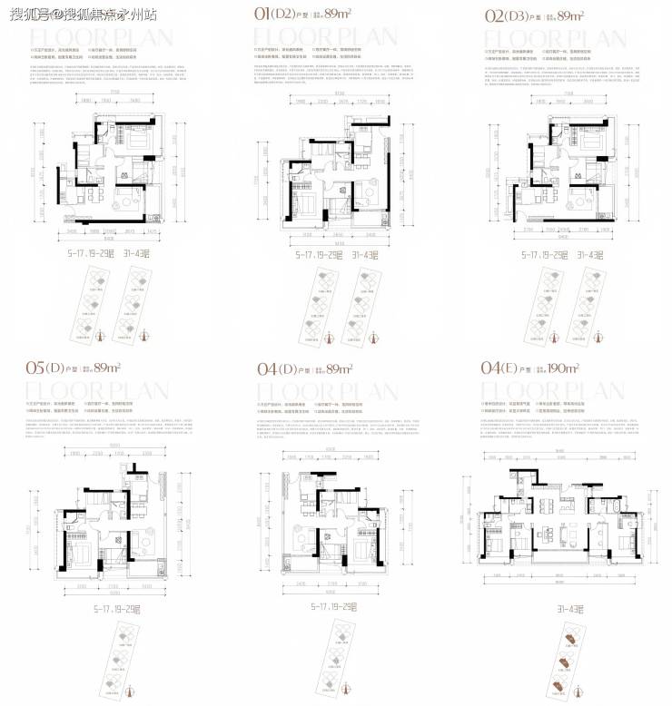 小面积产品,89-190㎡3-4房,楼栋结构均为中低区3T5,高区3T4,高度为43F。户型有约89㎡三房二卫,高区有约190㎡四房三卫,由两个D户型合并而成。