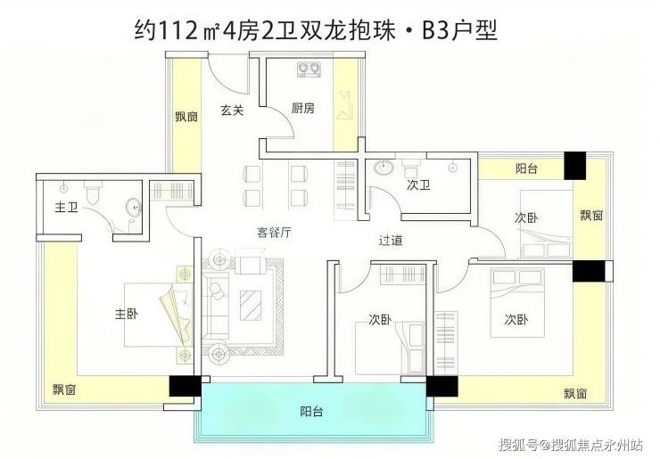 B3 户型:竖厅双龙抱珠格局,独立入户玄关,餐客厅一体化设计,四开间朝南,全屋八面飘窗,主卧和一个次卧均配备270°无柱转角飘窗,U 型厨房,卫生间干湿分离,客厅连接次卧出大阳台,朝向西南