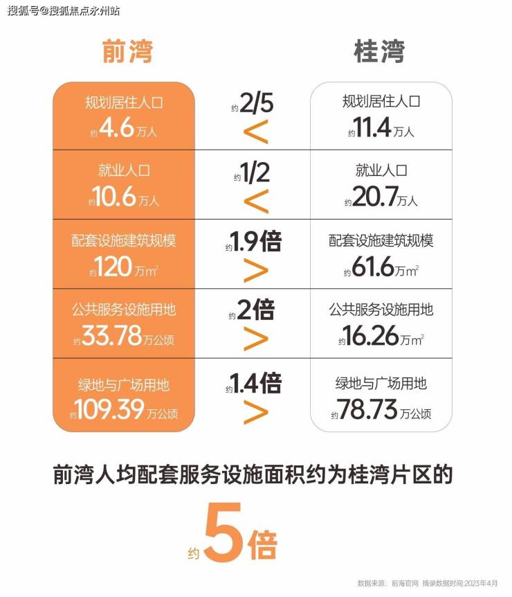 2021年,前海管理局下调前湾居住用地面积,从约24.59公顷渐少至约16.69公顷;从规划上看,前湾规划居住人口约4.6万人,就业人口约10.6万人,分别约为桂湾的2/5和1/2;配套设施建筑规模、公共服务设施用地、绿地与广场用地却约为桂湾的1.9倍、2倍、1.4倍,也即是按照居住人口计算,前湾人均配套服务设施面积约为桂湾的5倍。