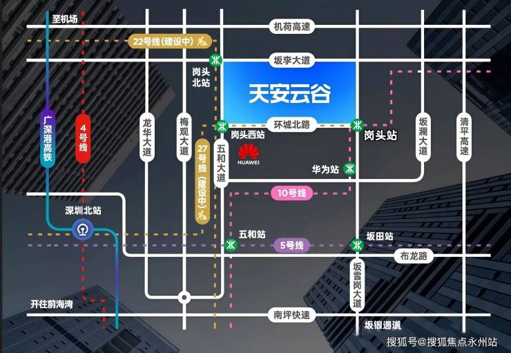 天安云谷三期交通网络发达,享有多条地铁线路覆盖:地铁10号线岗头站距离约1公里,已开通运营,可直达福田中心区,地铁27号线(在建)设有岗头站、岗头西站,距离约500-600米,预计2029年通车,地铁22号线(在建)设有岗头北站、风门坳站,距离约900-1400米,预计2028年建成。项目通过地下连廊与地铁站直接连通,岗头站C1/C2出口步行仅需5-8分钟,实现风雨无阻的通勤体验。