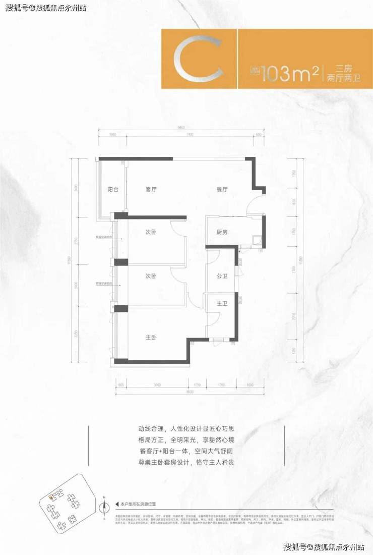 103㎡三房两厅两卫:户型西南朝向,竖厅设计。也是比较经典的户型设计,没啥大毛病。3.4米的客厅和阳台开间,
