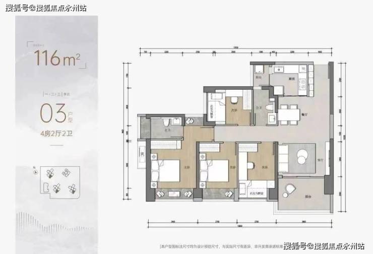 116平在97平原先结构基础上又多加了一个房间,而且客厅开间也是做到了 3.8m 更为阔绰。