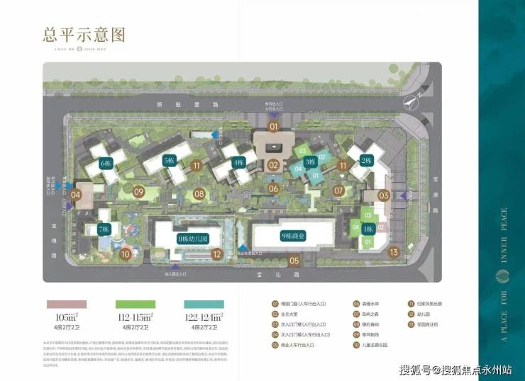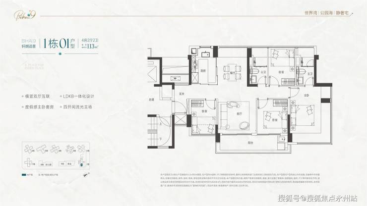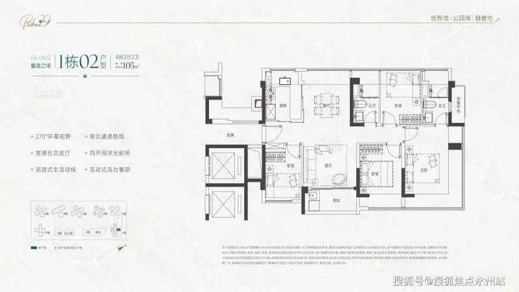 105㎡4房2厅2卫:入门级改善产品,采用竖厅南北通透格局,餐客厅分离设计,四开间朝南,全屋十面飘窗,主卧配备270°无柱转角飘窗,U型厨房设计,卫生间干湿分离,阳台朝向东南,得房率约100%,适配二胎家庭或三代同堂的基础改善需求。
