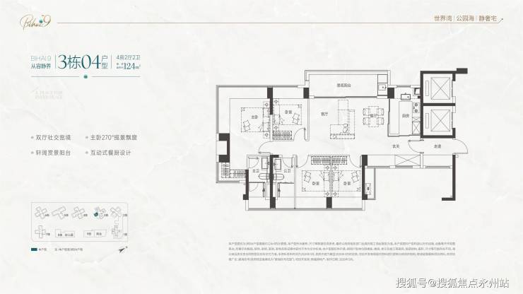 124㎡的4房2厅2卫,3栋04户型,设计的是横厅南北通透格局,独门独户,客餐厅一体化,五开间朝南,度假感主卧套房,主卧270°无柱转角揽景飘窗,U型互动式岛台餐厨,卫生间干湿分离,得房率约100%(包含赠送),客餐厅出超大阳台,西北朝向看公园景观。