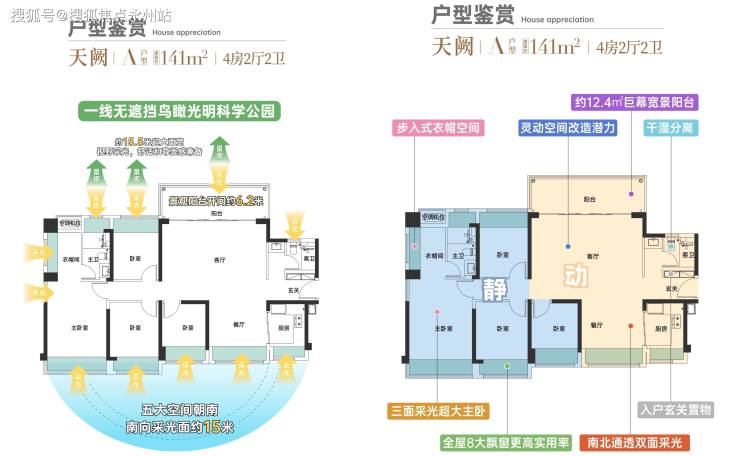 141㎡的4房2厅2卫,设计的是横厅南北通透格局,进门入户玄关,超宽客厅6.2米的开间,五开间朝南,4个卧室分别做到了主卧19.62㎡/次卧12.45㎡/次卧10.36㎡/次卧9.04㎡(包含墙体飘窗),主卧大套房设计,U型厨房,公卫三段式分离设计,得房率约:81.4%(不含赠送),阳台主朝东北向,看科学公园景观。