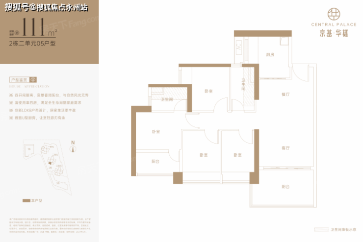 111㎡的3房2厅2卫,仅2栋2单元05户型才有,设计的是经典竖厅格局,LDKB一体化,动静分区,四开间朝南,U型厨房,卫生间干湿分离,得房率约73%(不含赠送),阳台西南朝向。