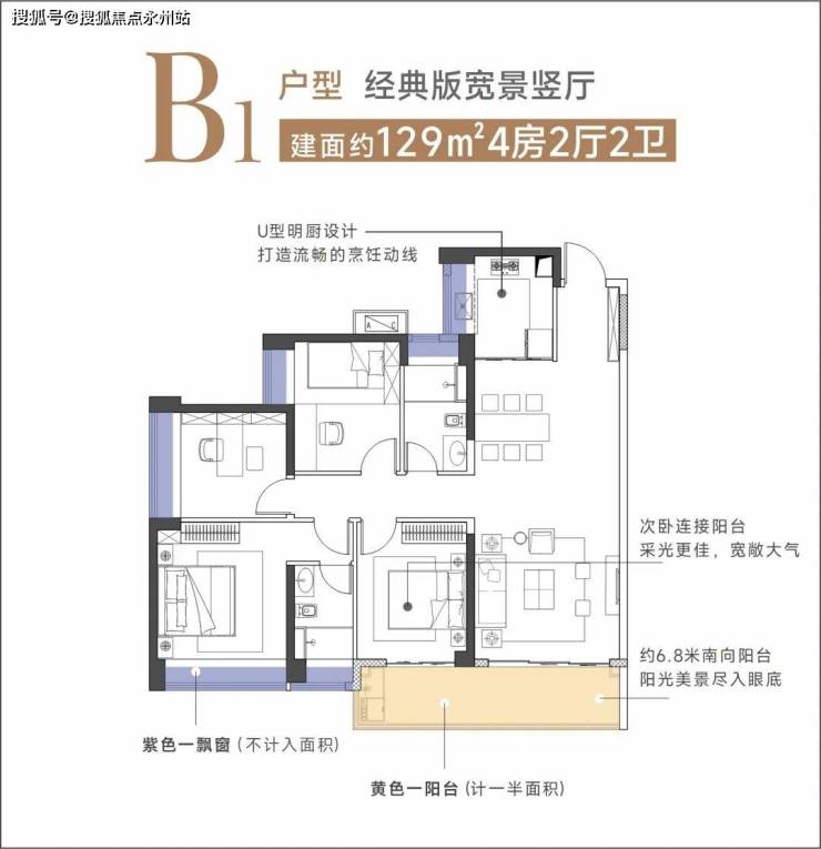建面约129㎡竖厅4房2厅2卫:经典实用竖厅格局,动静分离互不相扰,一体化餐客厅让空间观感更通透,也让生活尺度进一步延伸。约6.8米南向阳台视野开阔,次卧直通阳台,四季园景无遮入眸。主卧更配置大飘窗,收藏更多美景与阳光,容纳更多生活想象。