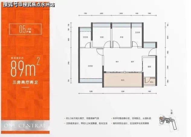 隐性过道横厅+5.3米宽景阳台,LDK一体化布局,宽景阳台+生活阳台+6飘窗的附加配置,比较讨年轻置业群体喜欢,室内在特定条件下可实现通透对流,隐性过道与客厅融为一体,使得动区部分空间感非常好,整体得房率、实用性优于88㎡户型。