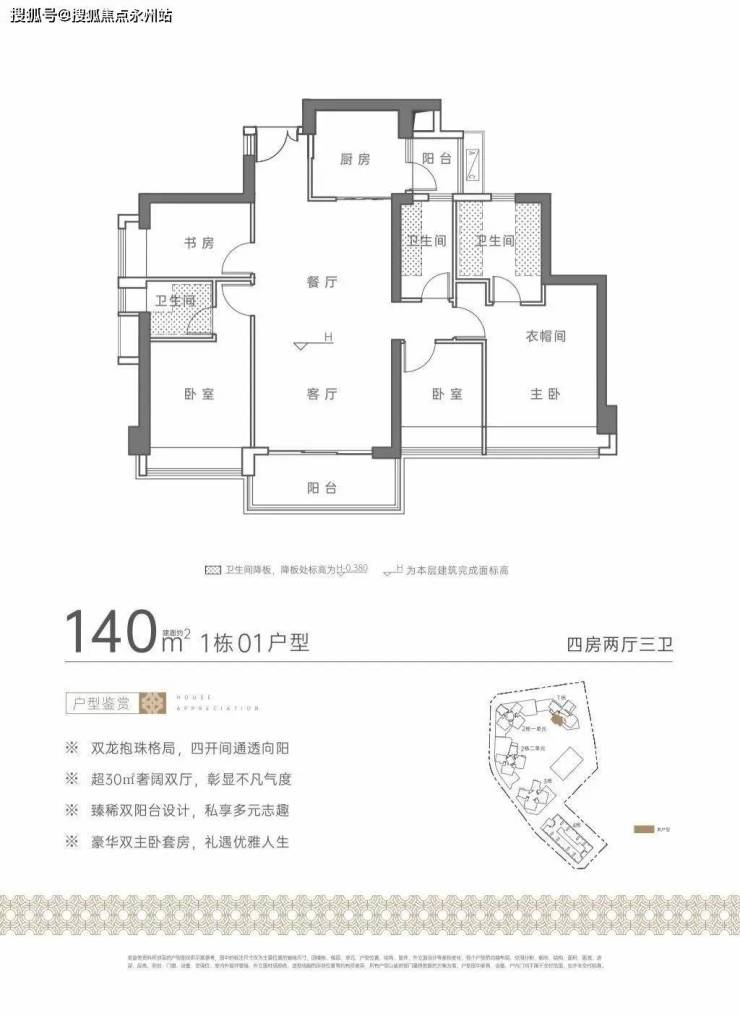 140㎡的4房2厅3卫:设计的是竖厅双龙抱珠格局,进门独立玄关,LDKB一体化设计,四开间朝南,双主卧套间,U型厨房,还带1个小生活阳台,得房率约75%(不含赠送),客厅阳台主朝西南向,看花园景观。