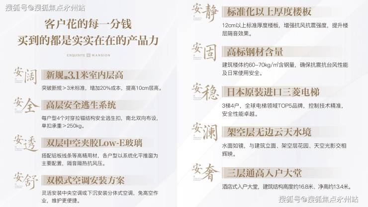 主力户型为91㎡三房(得房率89%)、113-123㎡四房(得房率94%),采用LDKB一体化设计,层高3.1米,公建化外立面(铝板+LOW-E 玻璃),日本三菱电梯,16.3米三层通高酒店式大堂。