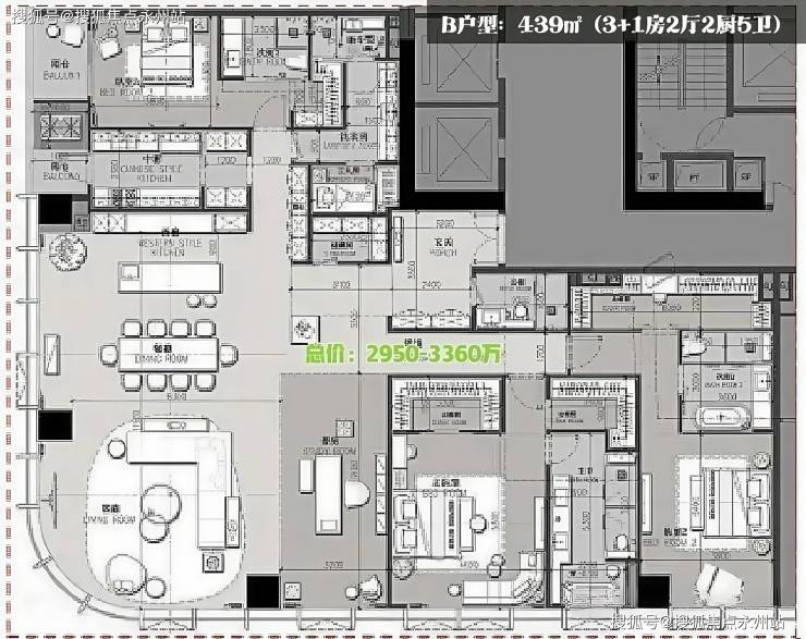 B户型:439㎡(3+1房2厅2厨5卫)LSD操刀、270°城市+绿化景观、高区看海、10米客餐开间。