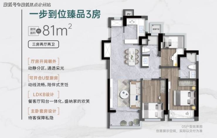 升级配置:主卧套房设计(独立卫浴+80公分飘窗),客厅开间3.05米,公共活动空间约 30㎡,全明空间,设备平台可改造为书房或儿童游乐区。