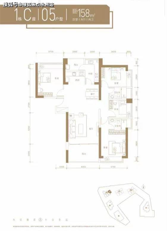 约158㎡四房两卫(1栋C座05户型)竖厅格局,餐客一体化,客厅开间约4.4米,主卧开间约3.7米,卫生间干湿分离设计,东南朝向。