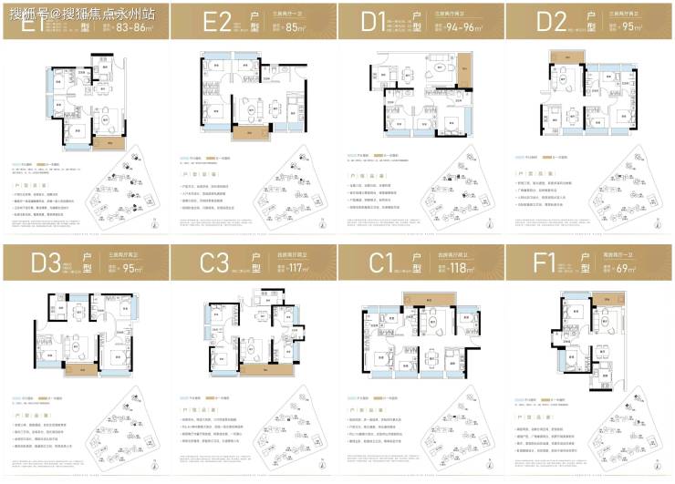 95㎡的3房2厅2卫(D3),设计的是竖厅双龙抱珠格局,客厅3.7米开间,三开间朝南,L型厨房,得房率:72.95%(不含赠送),阳台主朝东南或西南朝向。