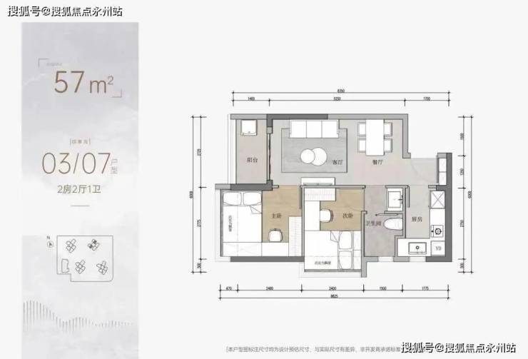 57平2房2厅户型:客厅开间2.75m ,而且还做了一个独立的玄关位,,非常适合小两口刚需上车自住使用,也是卖的最快的一个户型。