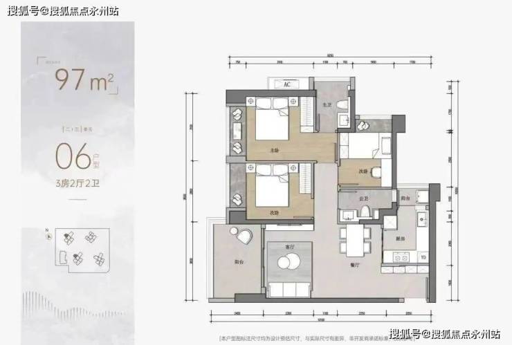 97平3房2卫的户型:客厅开间做到了3.6m而且阳台还不是承重墙,也就是说咱们的客厅还能往外推一些,做一个更大的公区。阳台东南朝向可看小区园林景观,西南侧则可以看到南山的山景景观,采光及通风效果都是非常优质的。