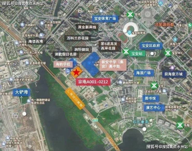 该地块位于宝中西侧,是宝中最后一个发展板块,具体位置在金科路与罗田路交汇处西南侧,北面是海韵学校、深航福利房深航假日名居,西面就是大铲湾,南面是湾区产业投资大厦,东面为新安中学(集团)高中部。