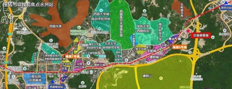 京基.御景峯,背靠塘朗山,面朝长岭皮水库,整个楼盘都被绿色植被环绕,生态景观来看十分优越。片区内超60%绿化控规,绿化覆盖率是深圳第一,看起来尤如世外桃源,但是它又是真切的位于深圳的经济科技最强区。