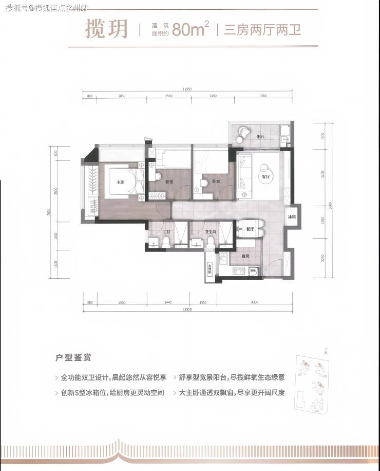 80㎡三房两卫:竖厅三房,动静分区,S型冰箱位,阳台空间约4.9㎡,主卧双飘窗,带独立卫生间。