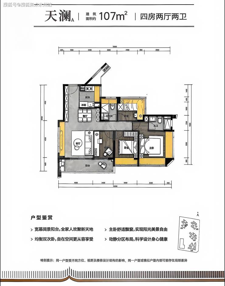 107㎡四房两卫:横厅南北通透格局,进门有入户玄关,客餐厅开间6米,4个卧室宽度分别为4.1米、3米、2.5米、2.4米,主卧套房设计,客厅连接次卧出6.7米长大阳台。