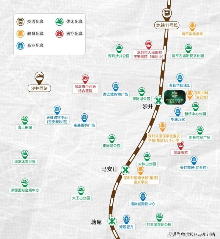 距离地铁11号线沙井站步行仅约460米,北侧为百佳华佳漾汇,可满足居住购物与娱乐需求,且2公里范围内有天虹商场、万丰海岸城购物中心,商业氛围较为浓厚。
