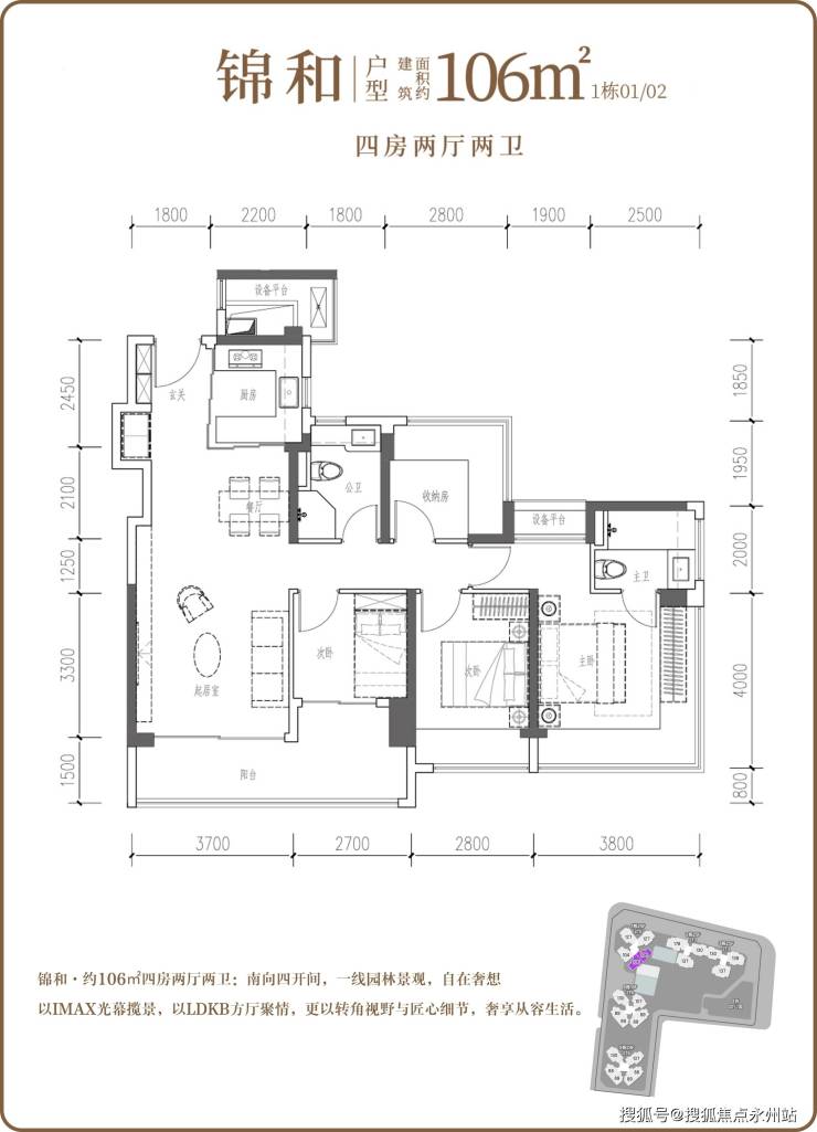 106㎡的4房2厅2卫,折后总价488-529万/套,单价4.6-5万。(1栋01、02户型)
