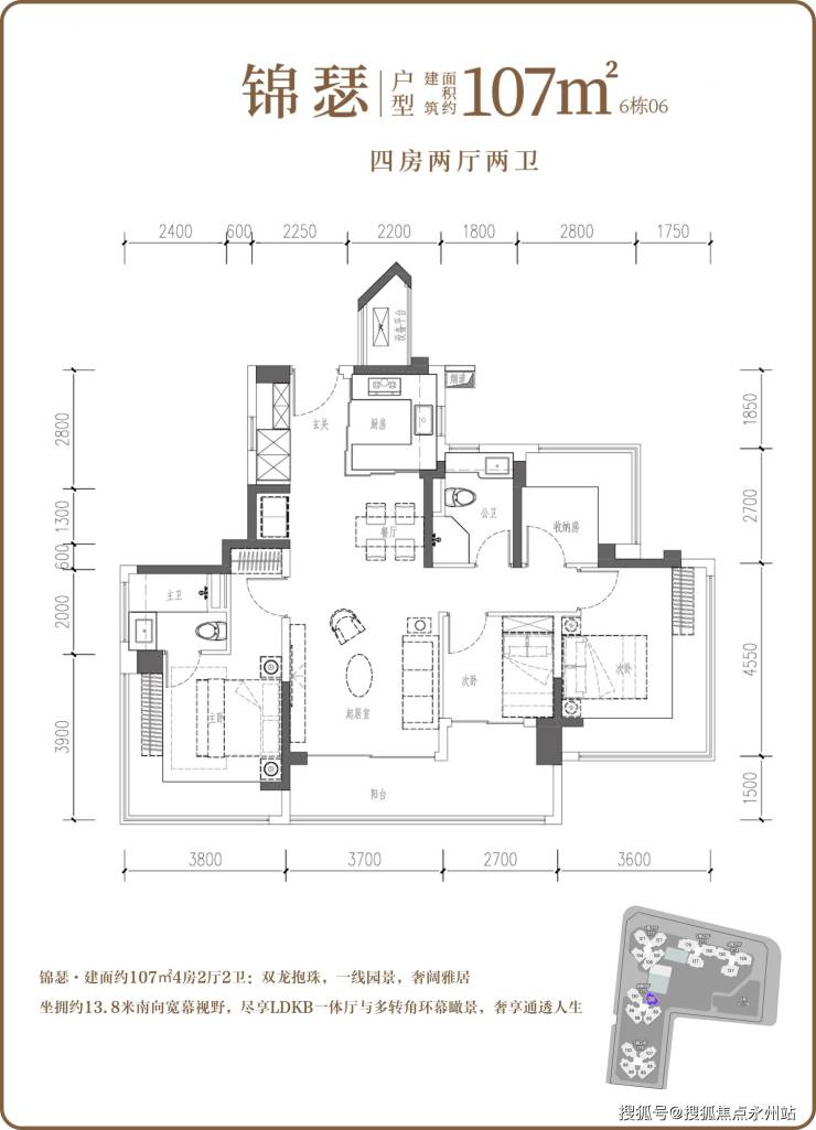 建面约107㎡四房两厅两卫:采用独特的双龙抱珠设计,是项目的特色户型。